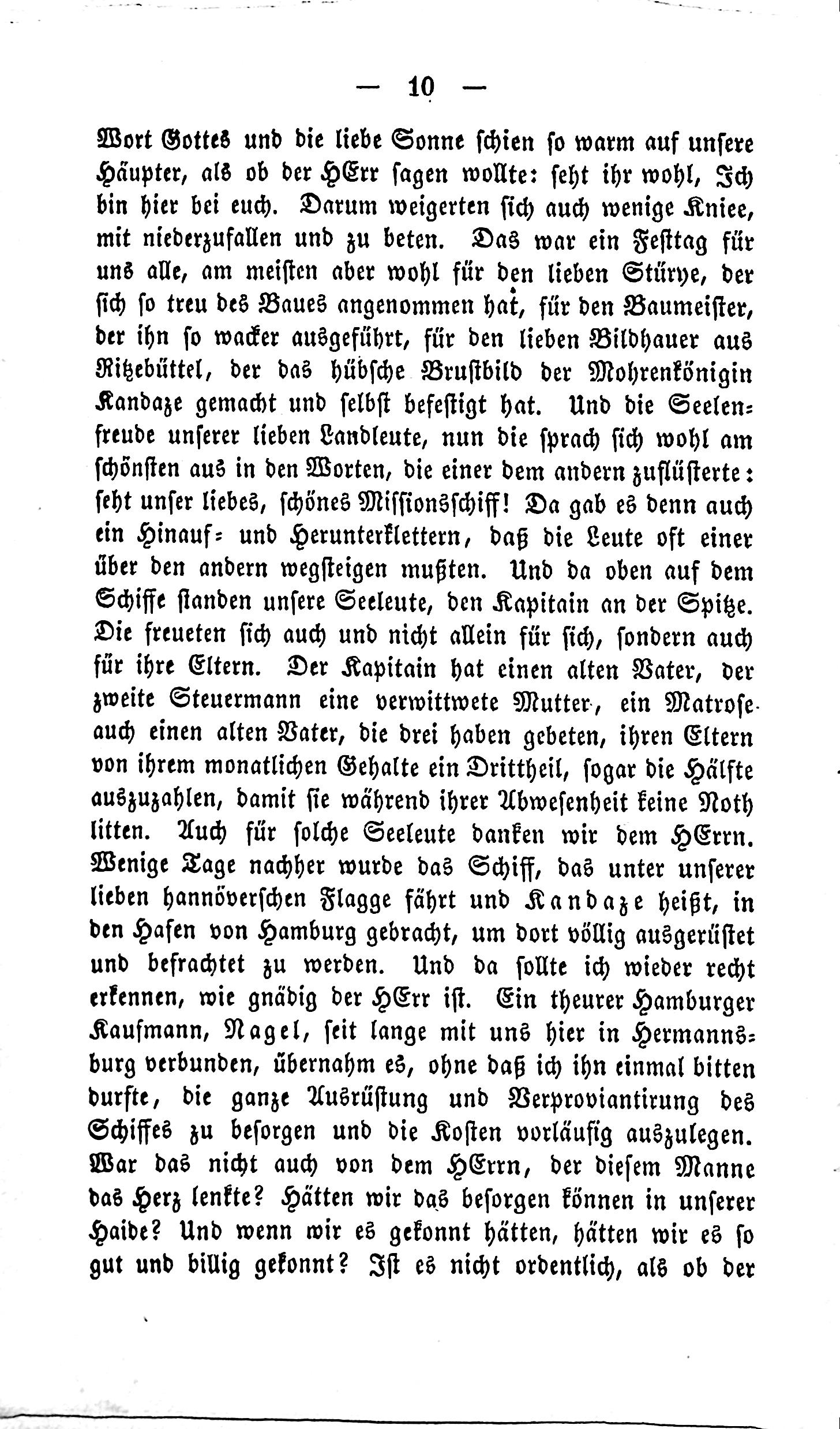 Translate from German to English: 19- Word of God and the loving sun shone so warm upon our heads as if he wanted to speak to us, do you think we shall see what he says? We refused to yield to even a few knees, with falling down and praying. This was a festival day for all, most of all for the dear Stürye, who stood true to the building’s acceptance, for the builder who had skillfully built it, for the loving artist from Ritzebüttel, who had created the beautiful chest image of the Mohrenkiinigin Kandaze, and even attached it. And the souls’ joy of our beloved landpeople now spoke beautifully in the words that one whispered to the other: see our beloved, beautiful mission ship. There was also a rise and a fall, that people often went away from one another. And on the ship, our sailors stood at the head. The sailors also enjoyed, and not just for themselves, but also for their parents. The captain had an old father, the second officer a wounded mother, and a matrose also an old father, three of them asked for their parents' allowance to be paid out during their absence; even half of it was allocated, so that they wouldn’t suffer from hardship during their absence. Even for such sailors, we thank God. A few days later, the ship, which sailed under our beloved Hanover flag, Kandaze, was brought into the harbor to be completely equipped and loaded. And I would again, rightly, recognize how dear God is. A noble Hamburg merchant Nagel, since long connected to us in Hermann's-burg, took it, without me ever asking him to obtain the entire equipment and provisions and to take out the costs beforehand. Was not this also what he of this man led? If we had been able to do that, we would have had it so well and cheaply? It isn’t proper, as if the