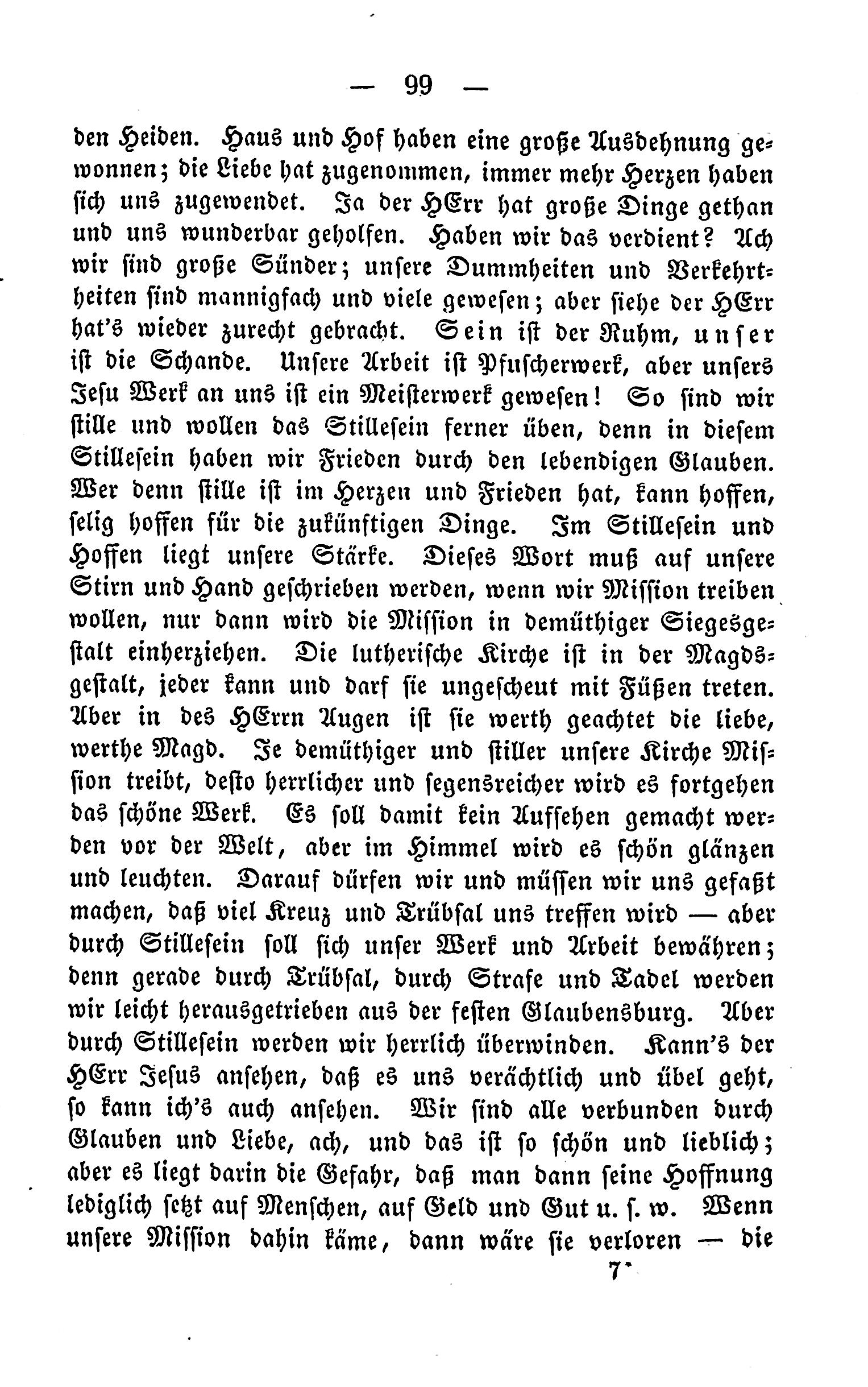 —99.— The Shepherd. Home and estate have a great extent conquered; love has grown, many hearts have been turned to us. Yes, the Lord has done great things and helped us greatly. Have we been rewarded? Ah, we are great southern; our foolishness and vice are manifold and many. But see, the Lord has once again rectified it. His is the glory, our is the shame. Our work is a mixture of craftsmanship, but it was the Lord's masterpiece in us! So we are silent and strive for stillness, for in this stillness we have peace through the living faith. Whoever is silent in the heart and has peace, can hope to be blessed, to hope for future things. In stillness and faith lies our strength. This word must be written in our hand and speech when we venture— to will, then the mission will follow a victorious path. The Lutheran church is in the Magdz-gest, every can and must walk with them freely. But in the Lord’s eyes, they are valued the loving, the precious maid. The more and stiller our church ventures, the more glorious and blessed it will go. It should not make a stir before the world, but it will shine beautifully and shine in the sky. Therefore, we must and must accept that much sorrow and misery will strike us— but through stillness, our work and service will be revealed; for it is through sorrow, through punishment, and through rebuke that we are easily driven out of faith. But through stillness, we will overcome. May the Lord Jesus see that it is not unworthy and evil to go astray— so I can also see it. We are all connected by faith and love, ah, and that is so beautiful and lovely; but it is in this danger that we place our hope solely on people, on money, and on good. If our mission were to come, it would be lost —.- the 7th.